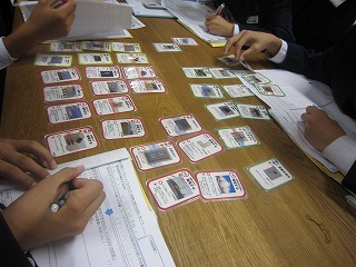 隣の木工室にて、実際にユニットカードを 手にして話し合う参加者の様子 |