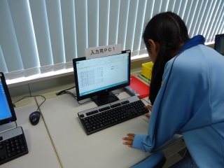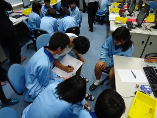 | 生徒がコンピュータでデータを入力している様子 | グループで話し合いをしている様子 |
