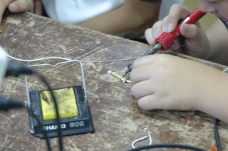 | (左下)視聴覚機器を活用した演示 | (右下)蛍光灯の端子とコードのはんだづけ | |