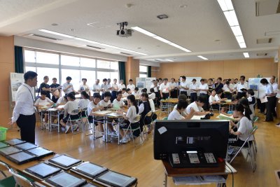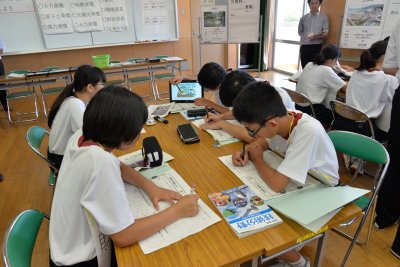 | 授業の様子 ※架空の市町村の首長や財政部長等の役職を班内で分担し、自分の市町村に誘致したい発電方法を考える | ||