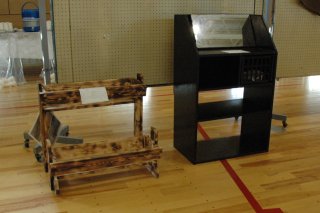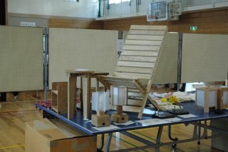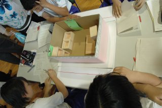 | 写真下:実験の様子(自室に見立てた箱を揺らし、地震発生時の被害をシミュレーションしている) | |
