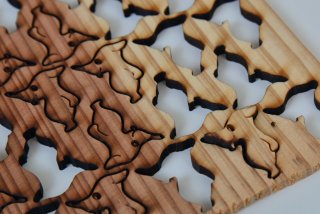 ![]() サンブスギの「チーバくんくん」は写真のように 一枚板からレーザーで切り出して作ります。 |